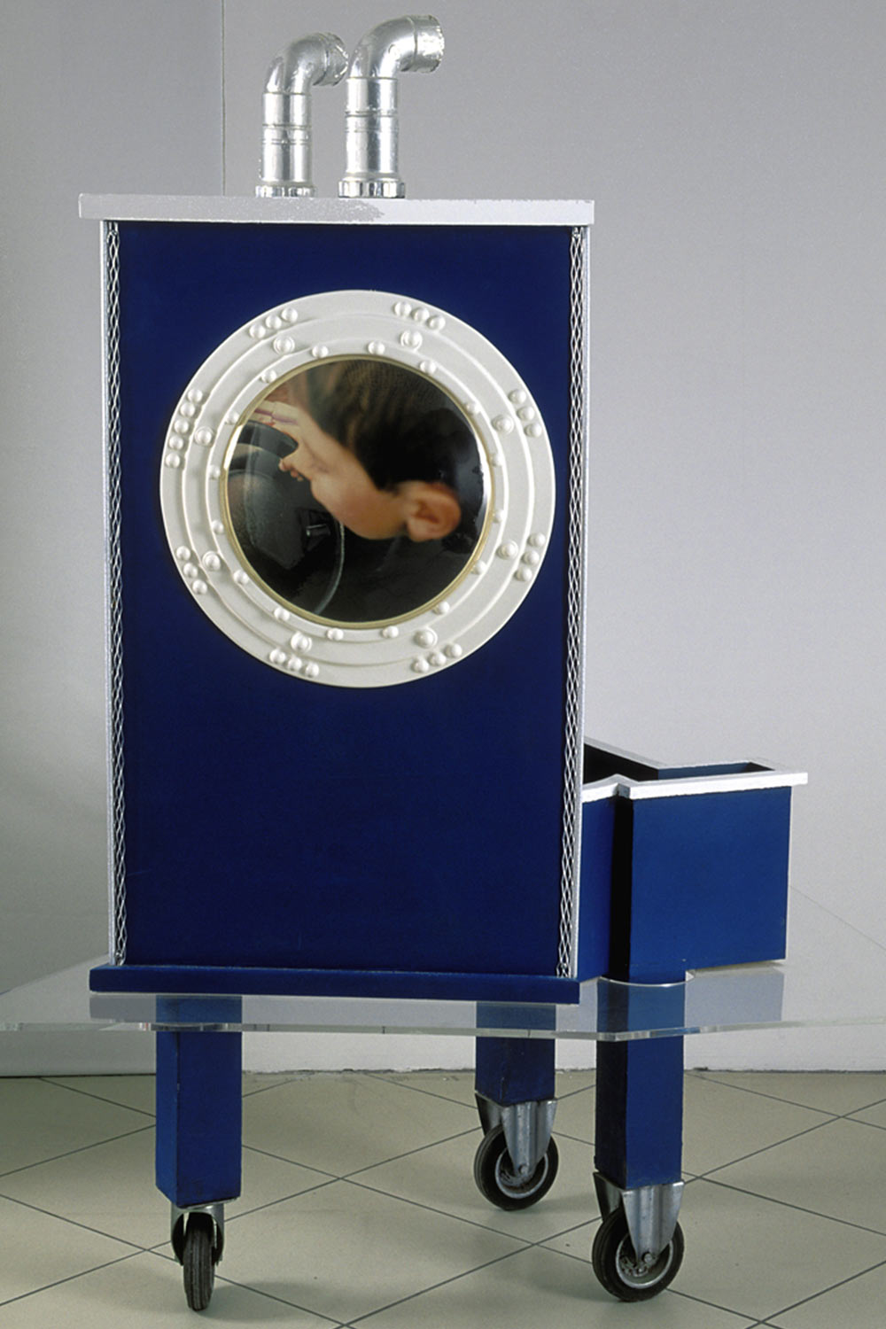 Ce bateau à roulettes vogue entre deux A majuscules placés sur deux murs, entrée et sortie en trompe l’oeil. Le bateau semblait arrêté dans sa course. La possible résonance d’un autre Aha de joie, celui poussé par l’enfant en photo dans les hublots du bateau de fête foraine.
