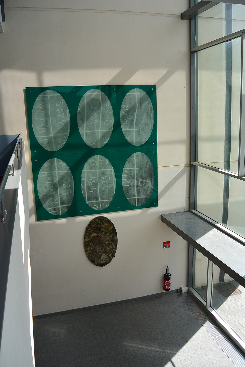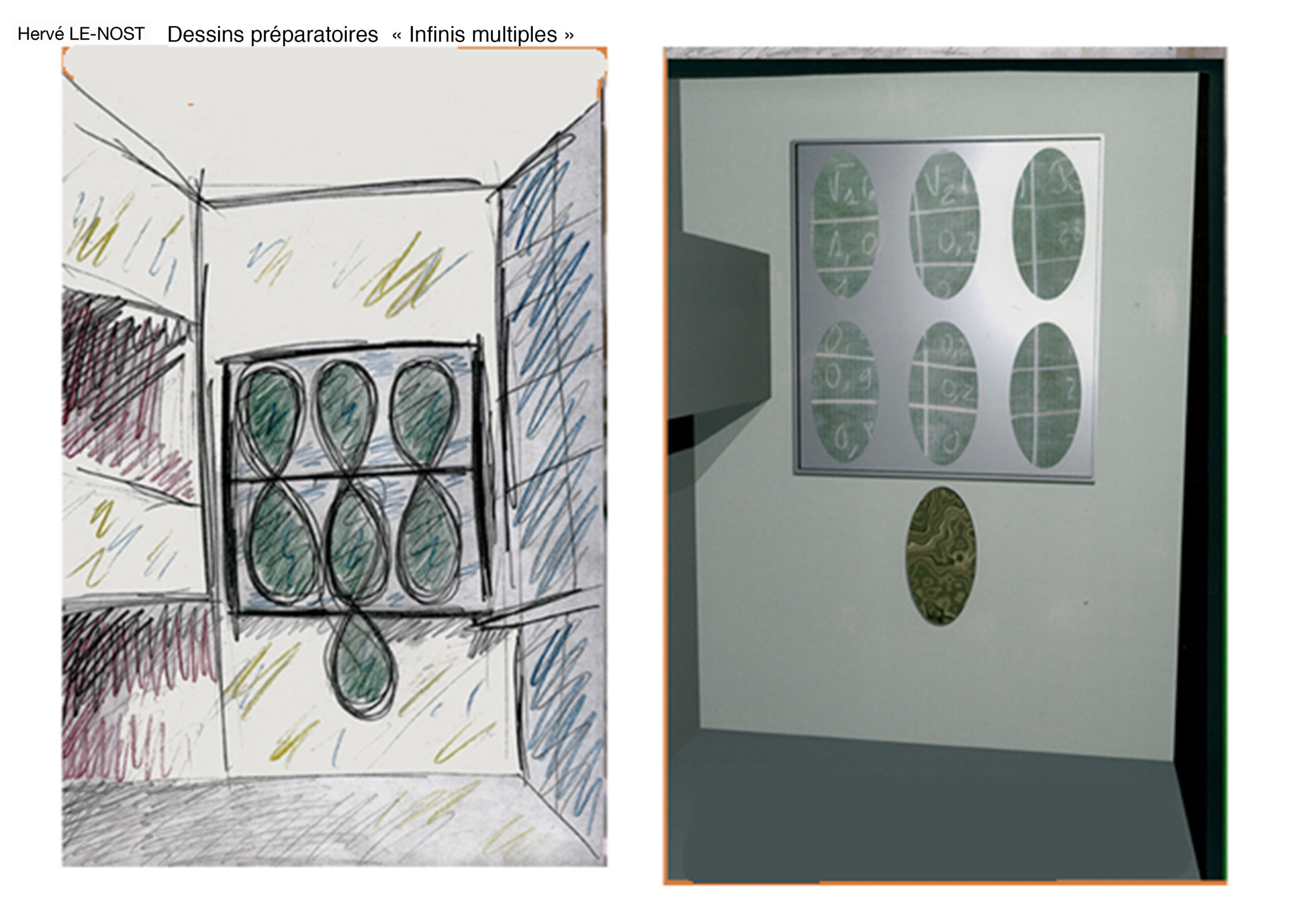 Infinis multiples est une pièce qui est installée dans le hall d’accueil de l’extension de l’école d’ingénieurs ESSTIN à Vandoeuvre les Nancy. Six formes ovales révèlent six fragments d’une photographie d’un tableau noir sur lequel figurent une série de chiffres inscrits à la craie ainsi qu’un point d’interrogation. Ce tableau figurait dans une salle de cours. Deux feuilles de verre sérigraphiées de 300 x 150cm sont placées bord à bord au dessus d’une septième forme ovale en pierre de marinage. La pierre de marinage résulte de la fossilisation d’un ruisseau. Les éléments aquatiques semblent figés dans la pierre.