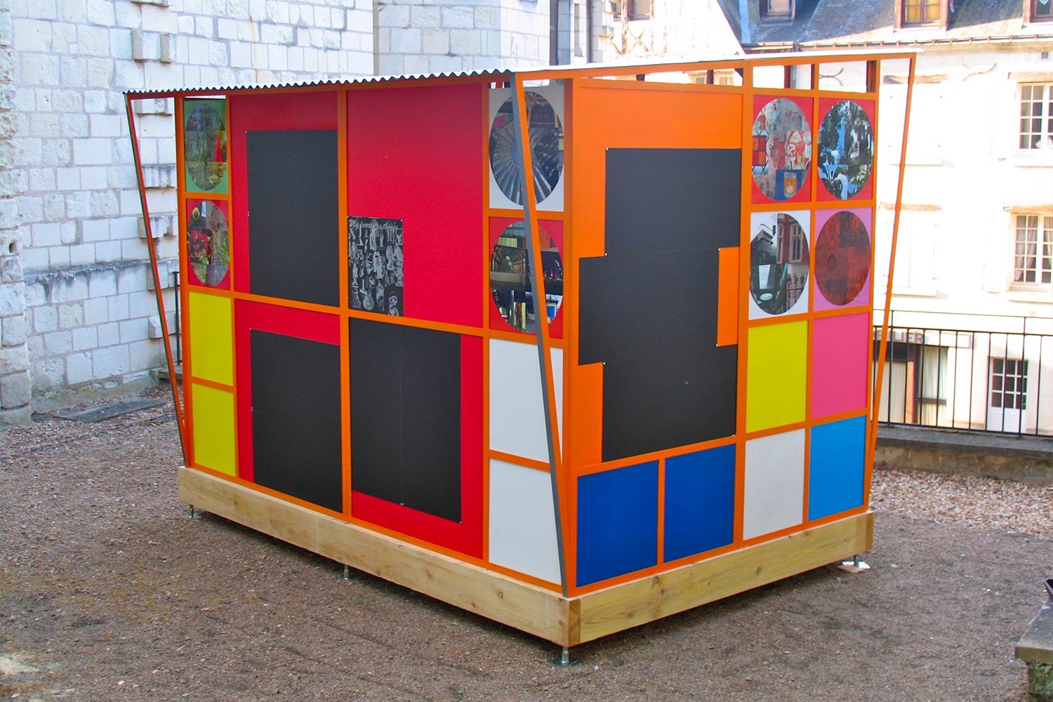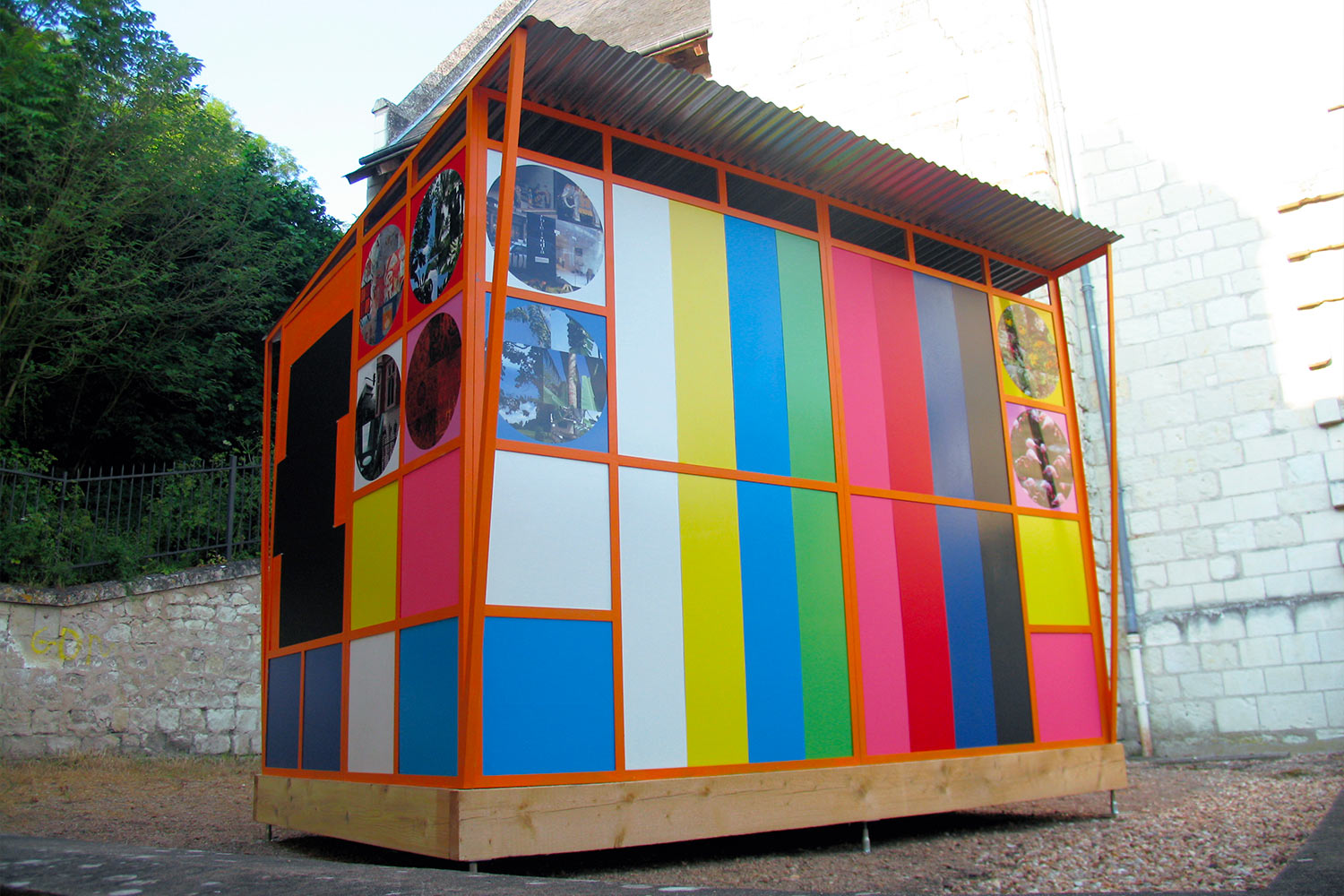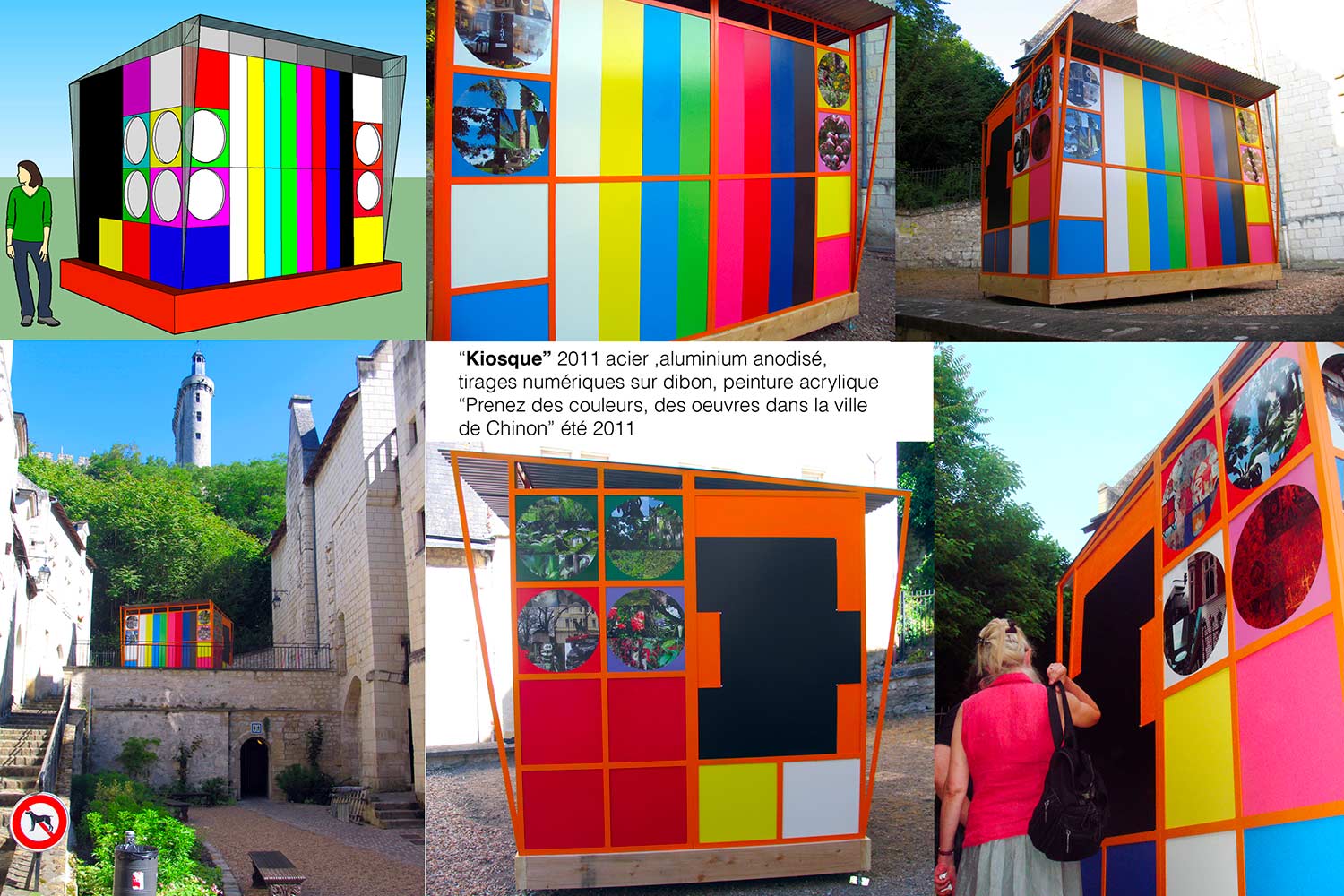 Kiosque a été présenté à Chinon dans le cadre de l’exposition “ Prenez des couleurs “ pensée par Dominique Marchès. L’espace de la petite place dans la cité médiévale en contrebas des remparts m’avait été proposé pour y concevoir un projet en relation à la couleur.