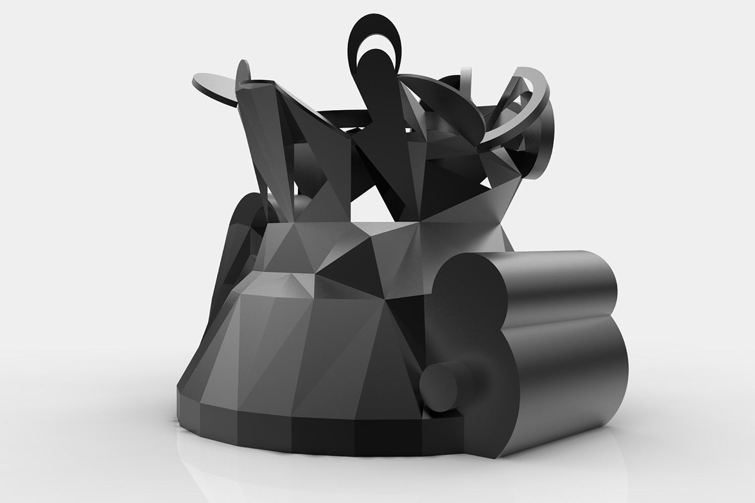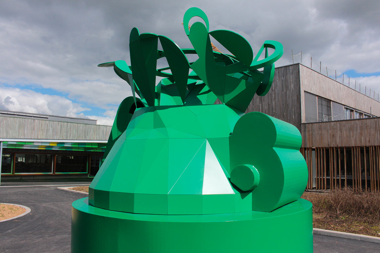 Un contexte est celui du collège et un autre est suggéré, celui du canal de Nantes à Brest et de ses berges, qui passe non loin de là. La sculpture le plongeur a été créée sur un fichier 3D. Il a été exporter vers une découpe laser sur acier qui a transformé cette forme virtuelle en une série de plaques découpées, et assemblées ensuite par un ferronnier par soudage et cela directement à une échelle finale. Cette forme figure la gerbe d’eau provoquée par l’impact d’un corps qui rencontre la surface de l’eau durant un plongeon. Forme figurative autant qu’abstraite. Le sujet du plongeon devient le prétexte à concevoir et réaliser une pièce monochrome dans le contexte de ce collège. Le sujet cède la place aux gestes et étapes de la sculpture.