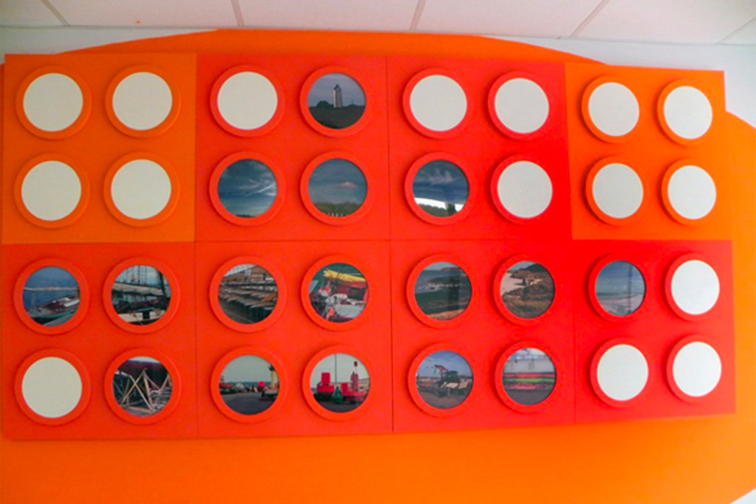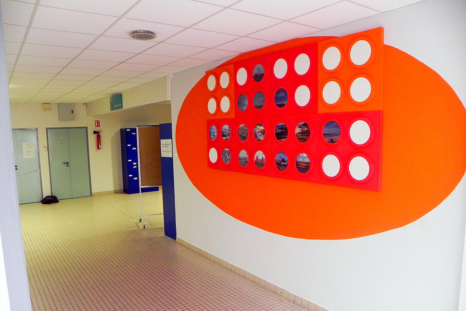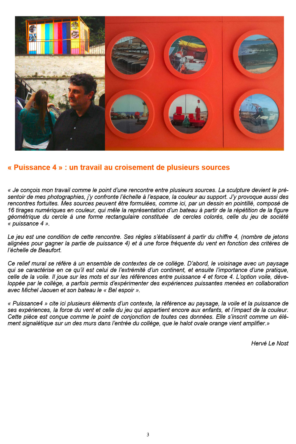 Puissance 4 est un grand panneau de bois peint comprenant des découpes laser circulaires. Ces cercles vitrés présentent des photographies du bord de mer de Lannilis et des Abers liés aux activités de la voile. Le collège des Abers comporte une option voile pour les collégiens. Puissance 4 en dehors d’être un jeu que l’on trouvait au foyer du collège, pouvait aussi désigner la puissance du vent. La pièce murale installée dans le hall d’accueil du collège, Puissance 4, a été conçue en relation avec ces activités liées à la voile qui animaient fortement ce collège.